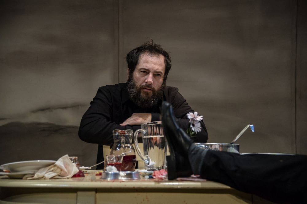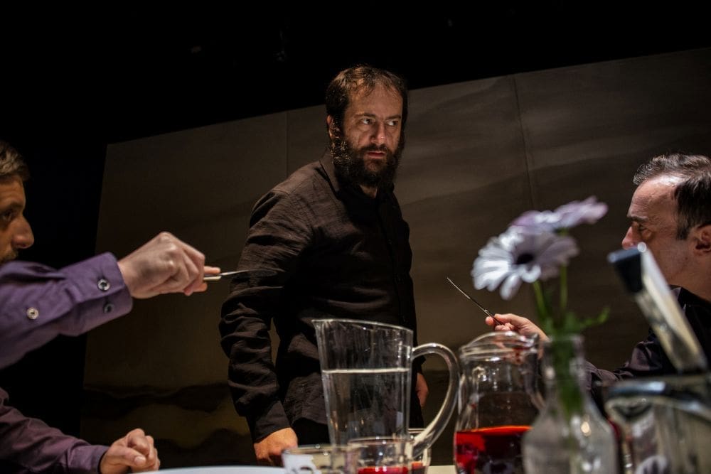Το κόκκινο φόντο συνοδεύει όλη την παράσταση. Δεν είναι διακοσμητικό στοιχείο· είναι παλλόμενο υπόστρωμα, αίμα και πάθος μαζί. Το τραπέζι με το κρασί, το ψωμί και τα λουλούδια, που αλλάζει μορφή ανάλογα με τη σκηνή, λειτουργεί σαν καθρέφτης της Ιστορίας. Κάθε αλλαγή στο σκηνικό έχει νόημα, κάθε αντικείμενο μιλά.